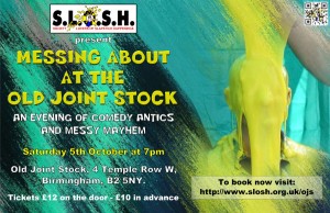 From the club that brought you Messing About at the Welly comes a new messy show in the heart of Birmingham. The show features slapstick routines and lots of messy games involving you the audience member. Taking part is optional but if you do - bring a change of clothes. We'll have facilities back-stage to get you clean again. Tickets are £10 booked in advance or £12 on the night. The show is open to everyone. More details and booking form at https://slosh.org.uk/ojs